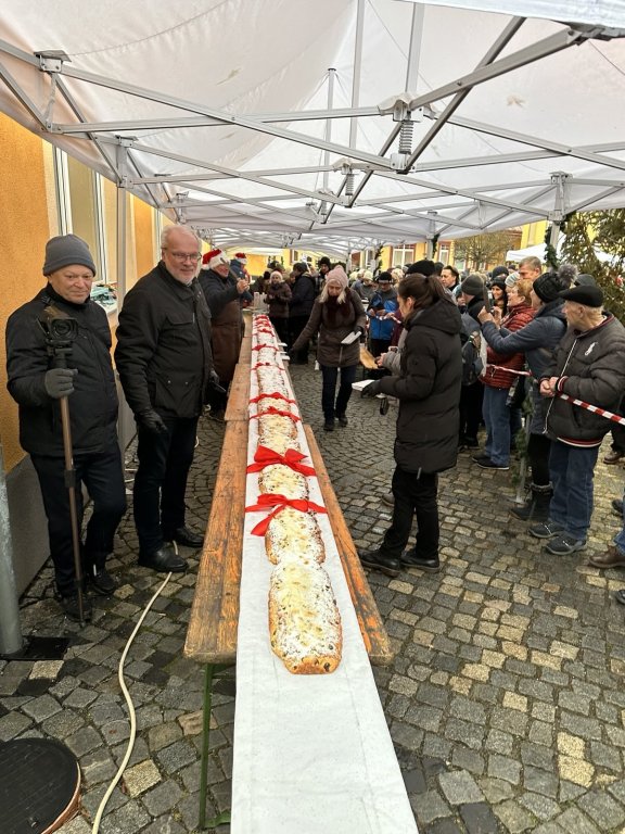 Ein besonderes Highlight des Weihnachtsfestes war der beeindruckende Weihnachtsstollen mit einer Länge von 10,21 Metern. In einer feierlichen Zeremonie wurde er von der Feuerwehr aus einem Nebengebäude auf den Marktplatz getragen und dort auf einem langen Tisch platziert. Anschließend schnitten Bürgermeister Vladimír Vorm, Altbürgermeister Andreas Rubner, André Worbs und Johannes Karl gemeinsam den Stollen an und verteilten die köstlichen Stücke an die Gäste.
